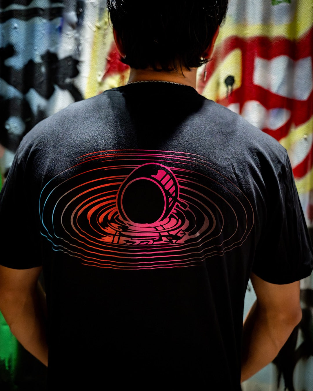 That is the inspiration behind the design - the first renditions of this design actually had the text included but we voted for just the artwork and it came out a lot cleaner. The floating "A" on the front left chest is different on every single tee - no two tees have the same placement - we did this to emulate the artwork of the movie where the main character's head is sunk in the water and you can see half man and half monster - both the front and back design pull from this scene.